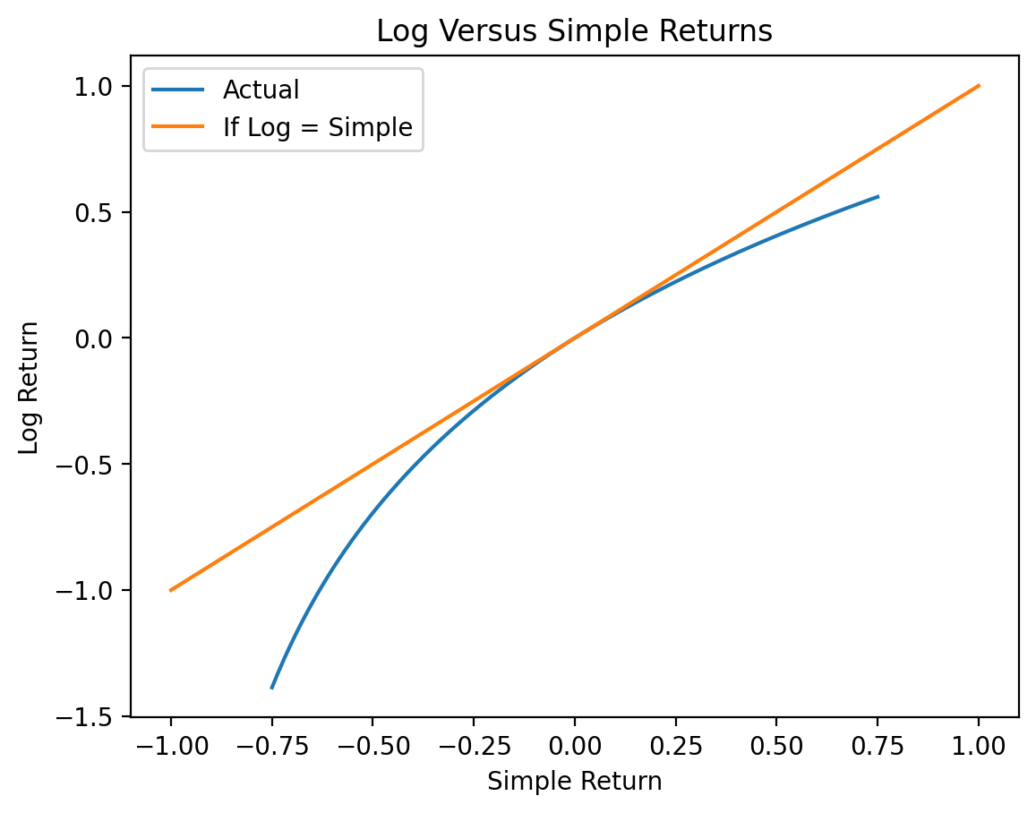 However, we may see log returns elsewhere, which are the (natural) log of one plus simple returns: \[R_{log,t} = \log(1 + R_{simple,t}) = \log\left(1 + \frac{P_t + D_t}{P_{t-1}} - 1 \right) = \log\left(\frac{P_t + D_t}{P_{t-1}} \right) = \log(P_t + D_t) - \log(P_{t-1})\] Therefore, we calculate log returns as either the log of one plus simple returns or the difference of the logs of the adjusted close column. Log returns are also known as continuously-compounded returns.