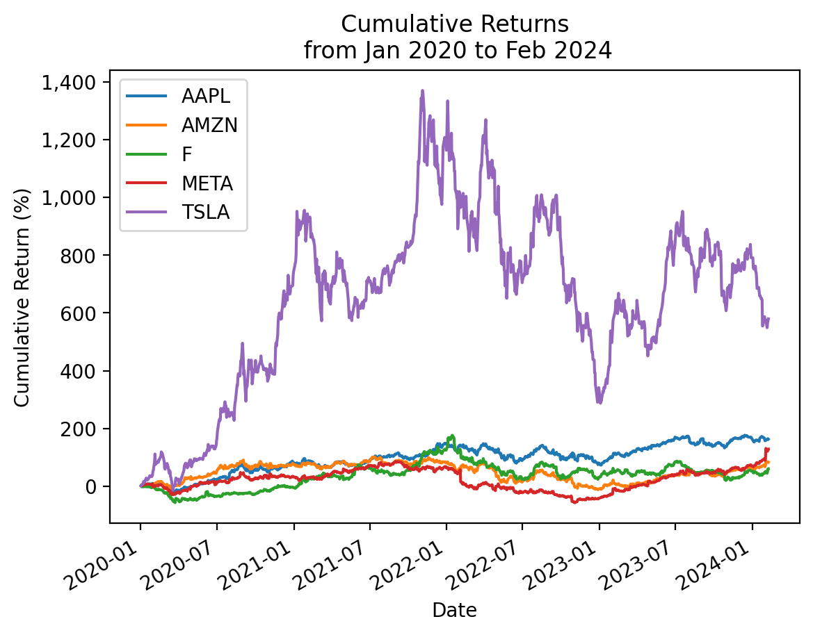 # tickers = ['TSLA', 'F', 'AAPL', 'AMZN', 'META']