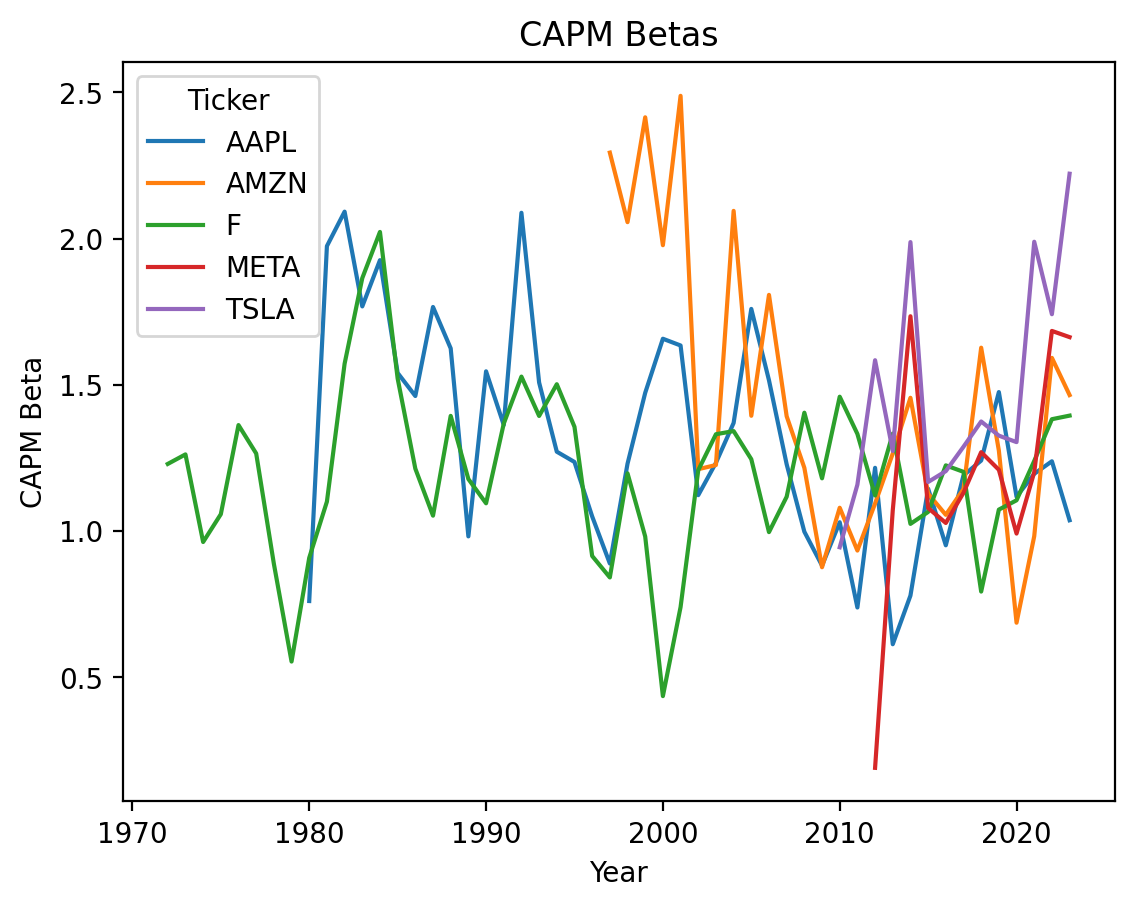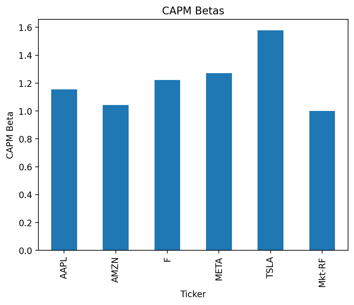 betas.tail()| Ticker | AAPL | AMZN | F | META | TSLA |