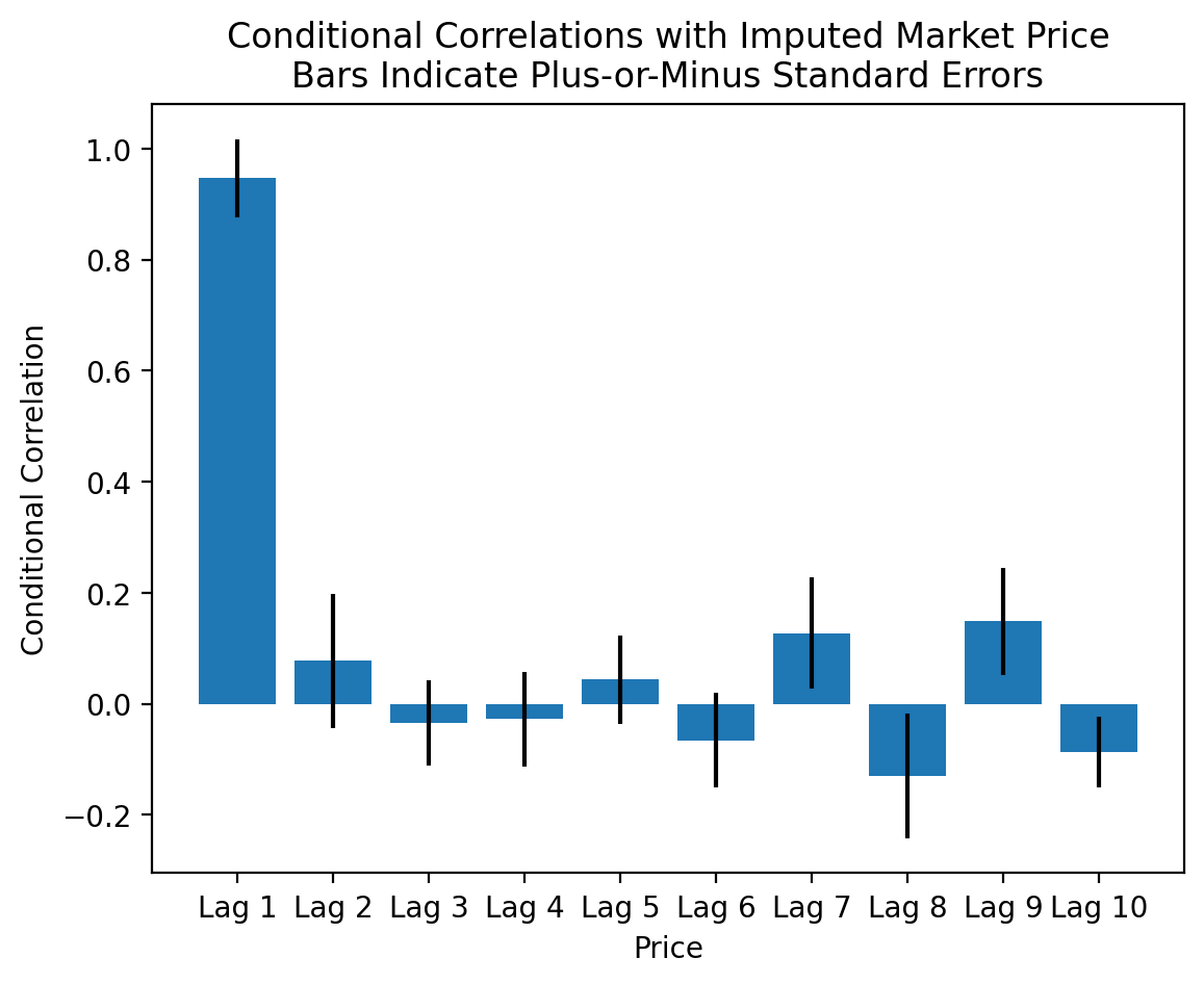 plt.title('Conditional Correlations with Imputed Market Price\nBars Indicate Plus-or-Minus Standard Errors')