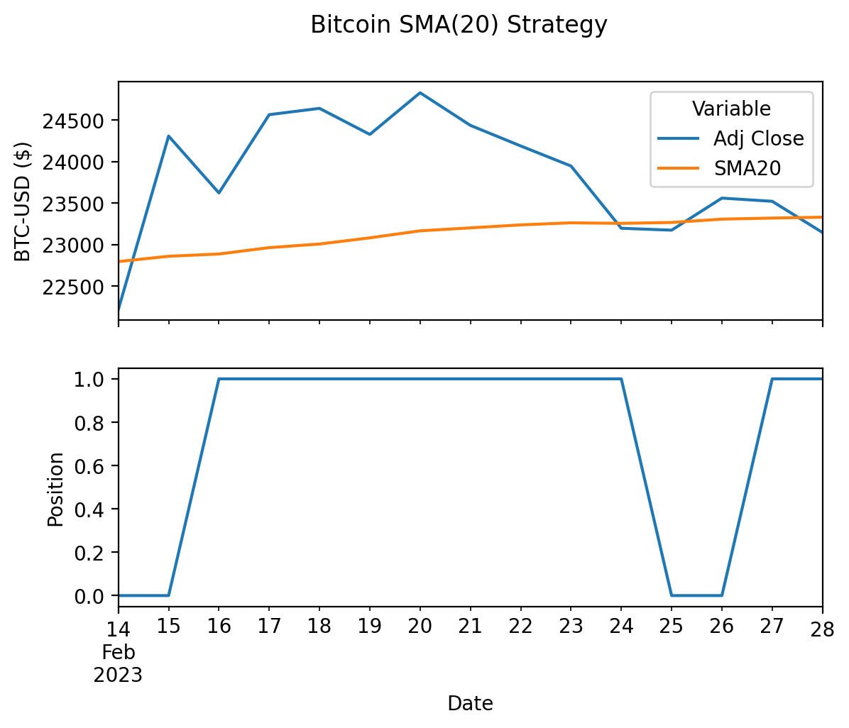I find it helpful to plot Adj Close, SMA20, and Position for a sort window with one or more crossings.