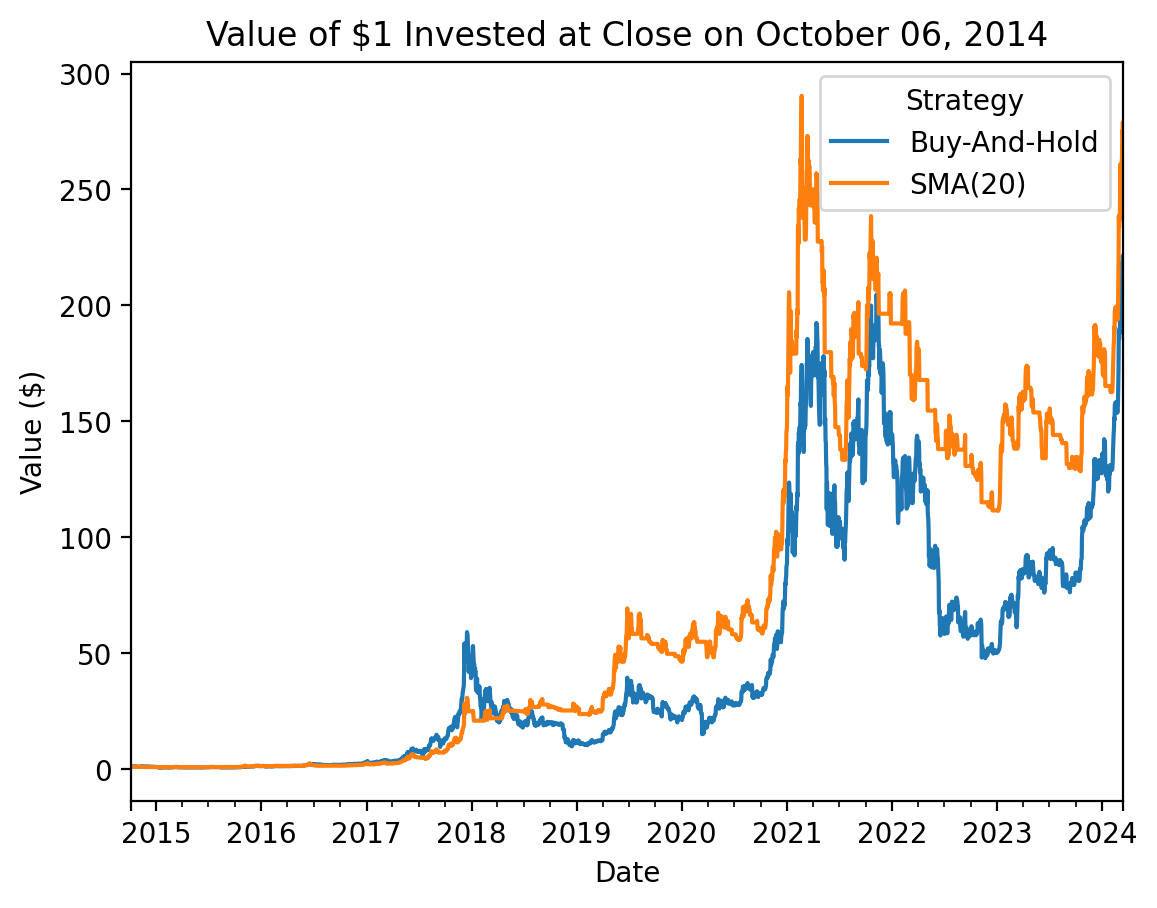 We can compare the long-run performance of buy-and-hold and SMA(20).