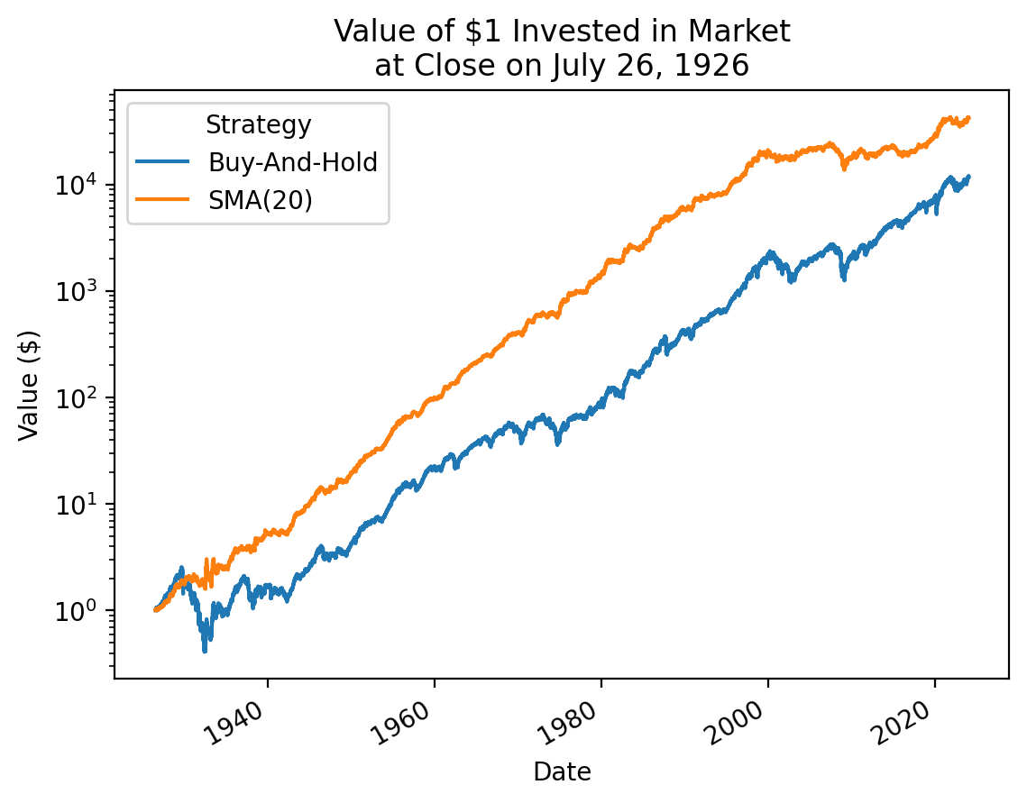 names_sma = {'Return': 'Buy-And-Hold', 'Strategy': 'SMA(20)'}