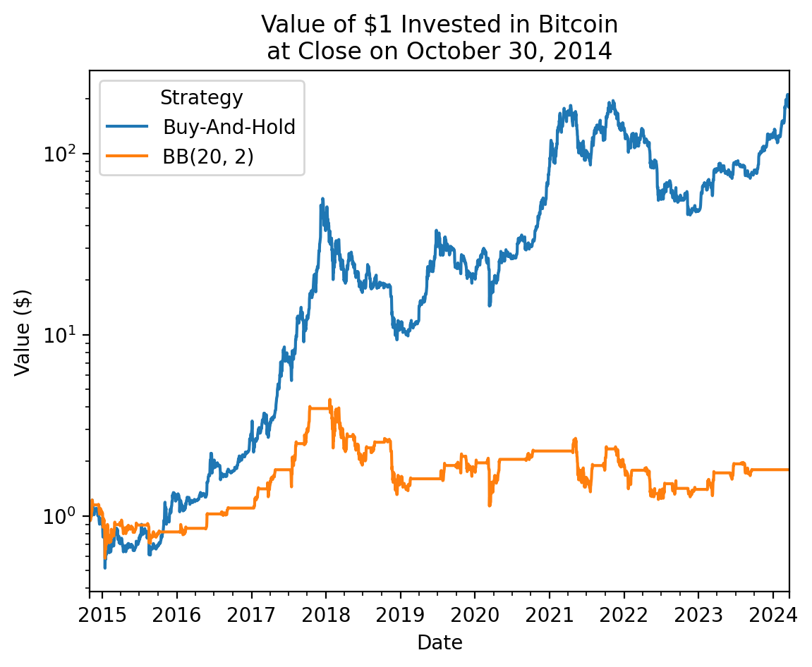 It might be helpful to plot a few months of Bitcoin prices and signals to better understand the BB(20, 2) strategy