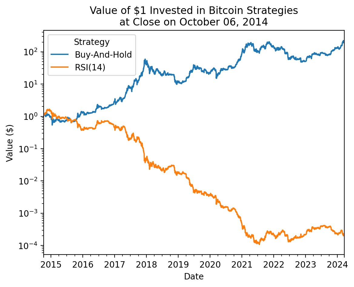 names_rsi = {'Return': 'Buy-And-Hold', 'Strategy': 'RSI(14)'}