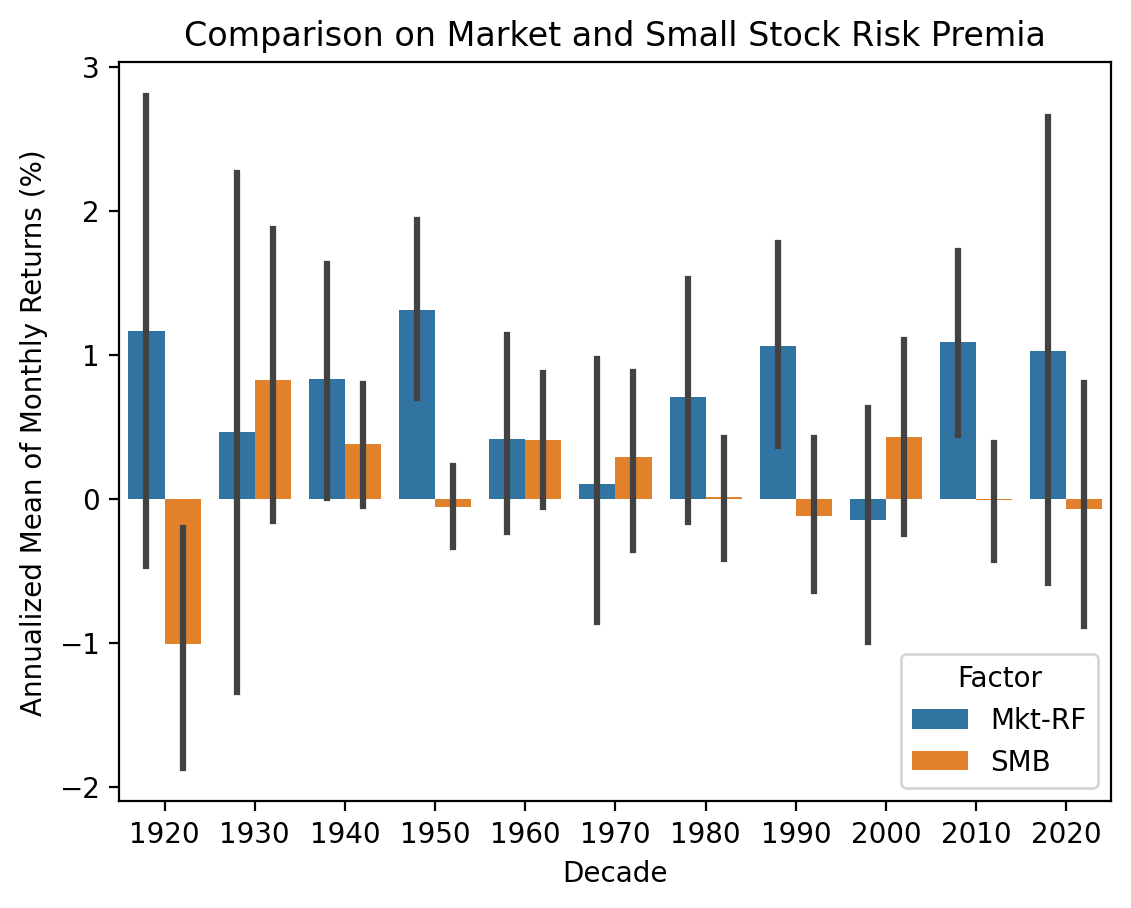 plt.title('Comparison on Market and Small Stock Risk Premia')
