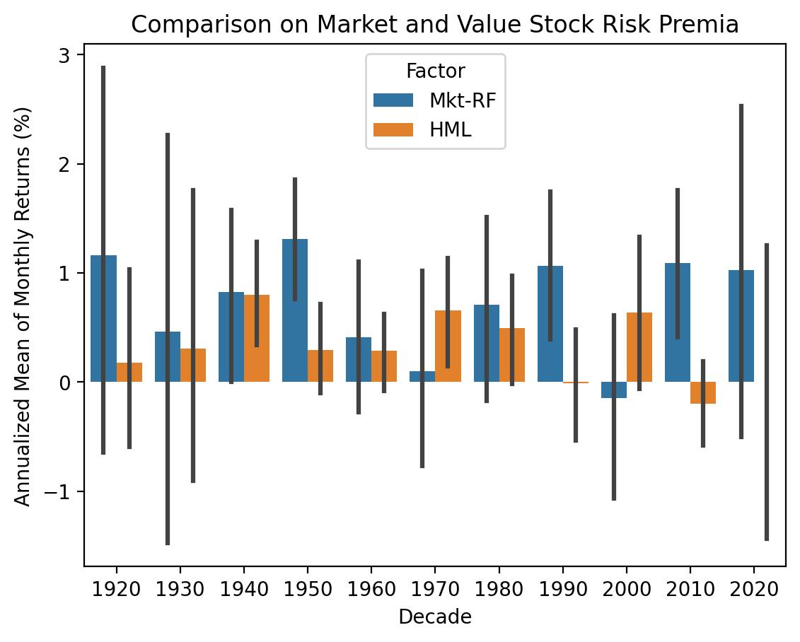 plt.title('Comparison on Market and Value Stock Risk Premia')