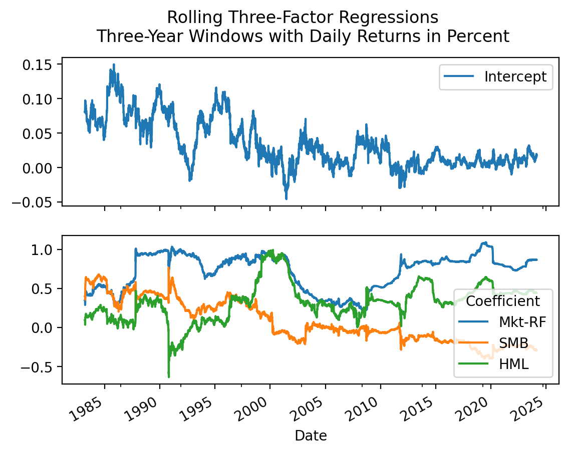 Use a three-year window with daily returns. How has Buffett’s \(\alpha\) and \(\beta\)s changed over the past four decades?