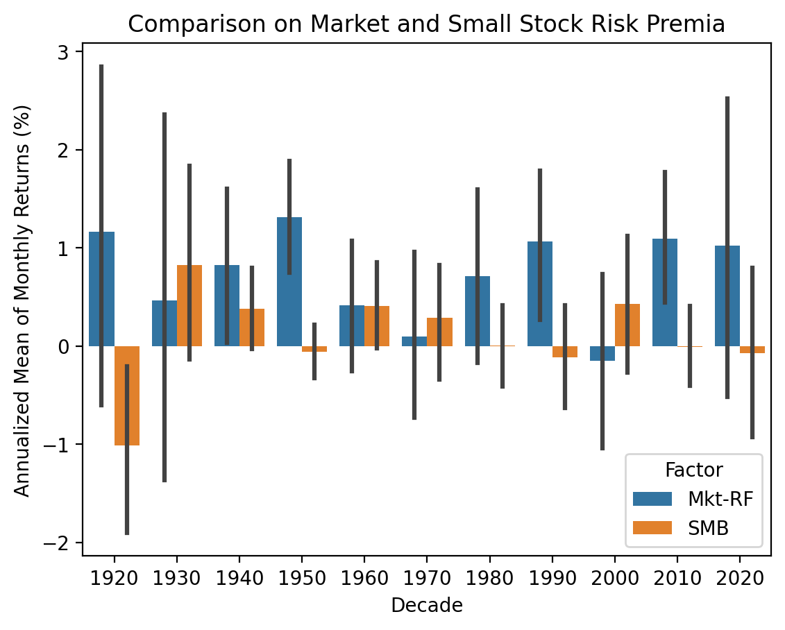plt.title('Comparison on Market and Small Stock Risk Premia')