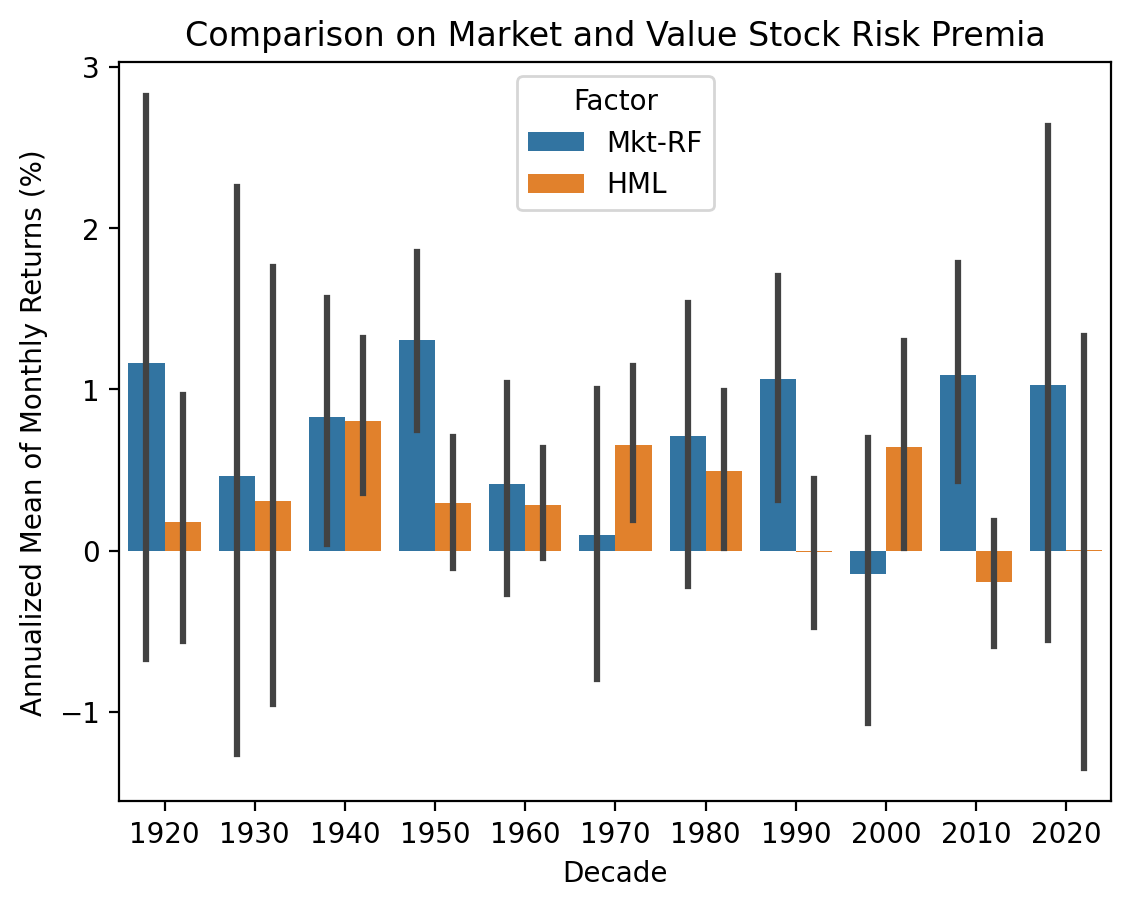 plt.title('Comparison on Market and Value Stock Risk Premia')