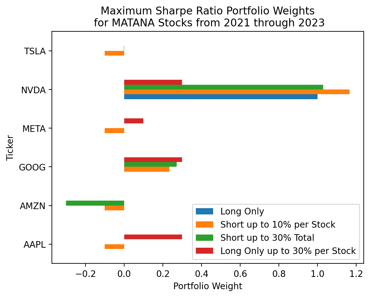 3.2 Find the maximum Sharpe Ratio portfolio of MATANA stocks over the last three years, but allow short weights up to 10% on each stock
