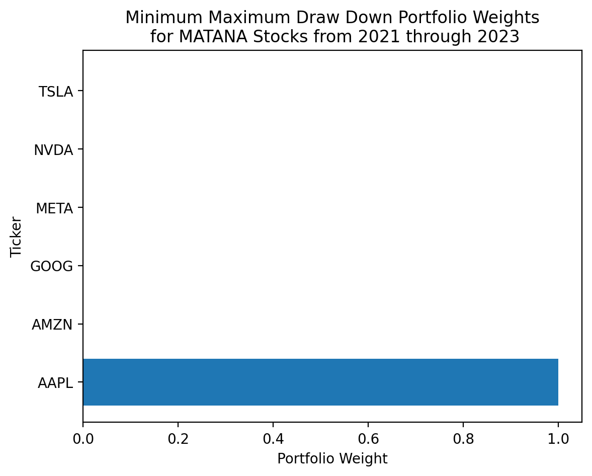 plt.title('Minimum Maximum Draw Down Portfolio Weights\n for MATANA Stocks from 2021 through 2023')