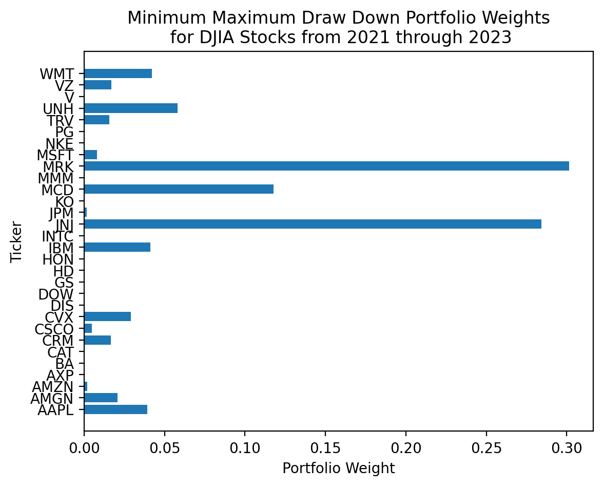 3.7 Find the minimum maximum draw down portfolio with all available data for the current Dow-Jones Industrial Average (DJIA) stocks