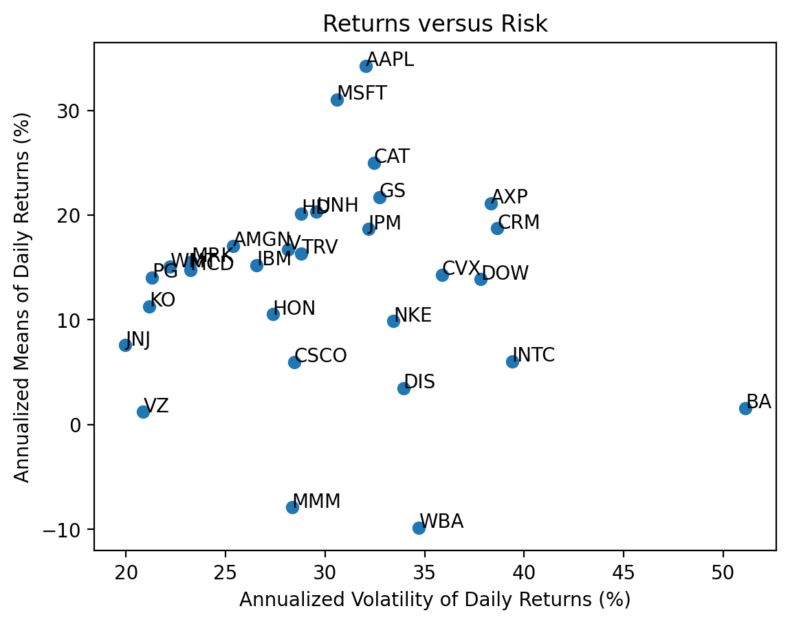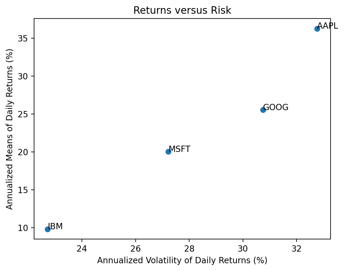 3.4 Plot annualized means versus standard deviations of daily returns for these four stocks