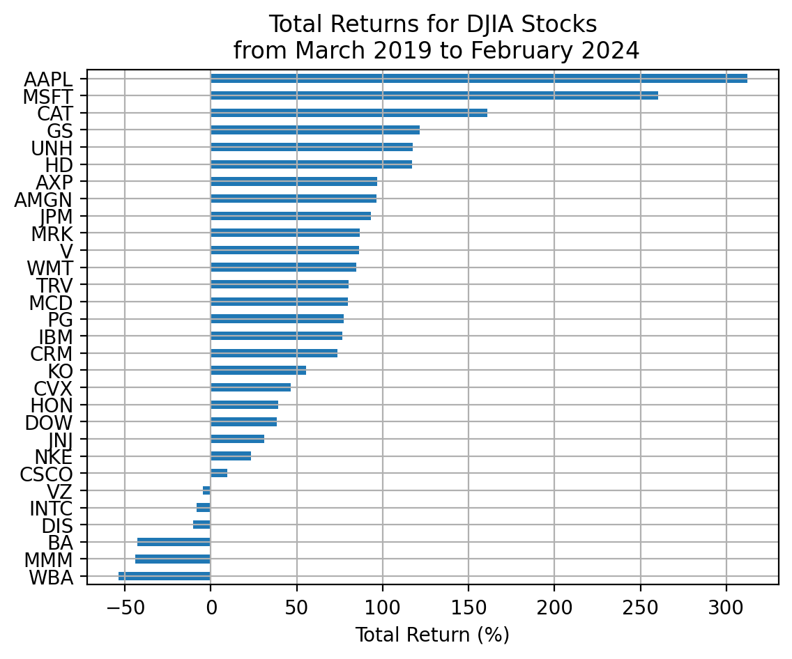 plt.title(f'Total Returns for DJIA Stocks\n from {start_date:%B %Y} to {stop_date:%B %Y}')