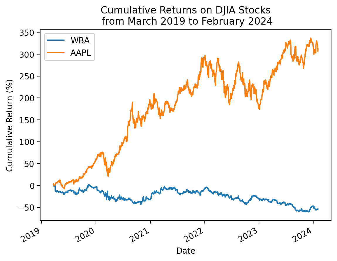 total_returns2.sort_values().iloc[[0, -1]].indexIndex(['WBA', 'AAPL'], dtype='object')