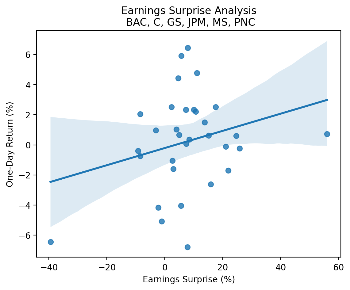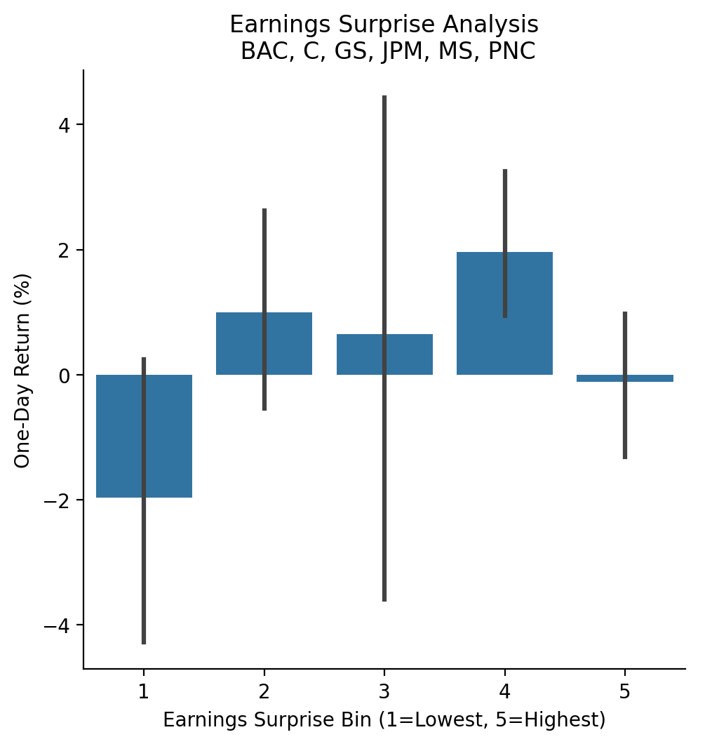 barplot()from the seaborn package after usingpd.qcut()to form five groups on earnings surprises