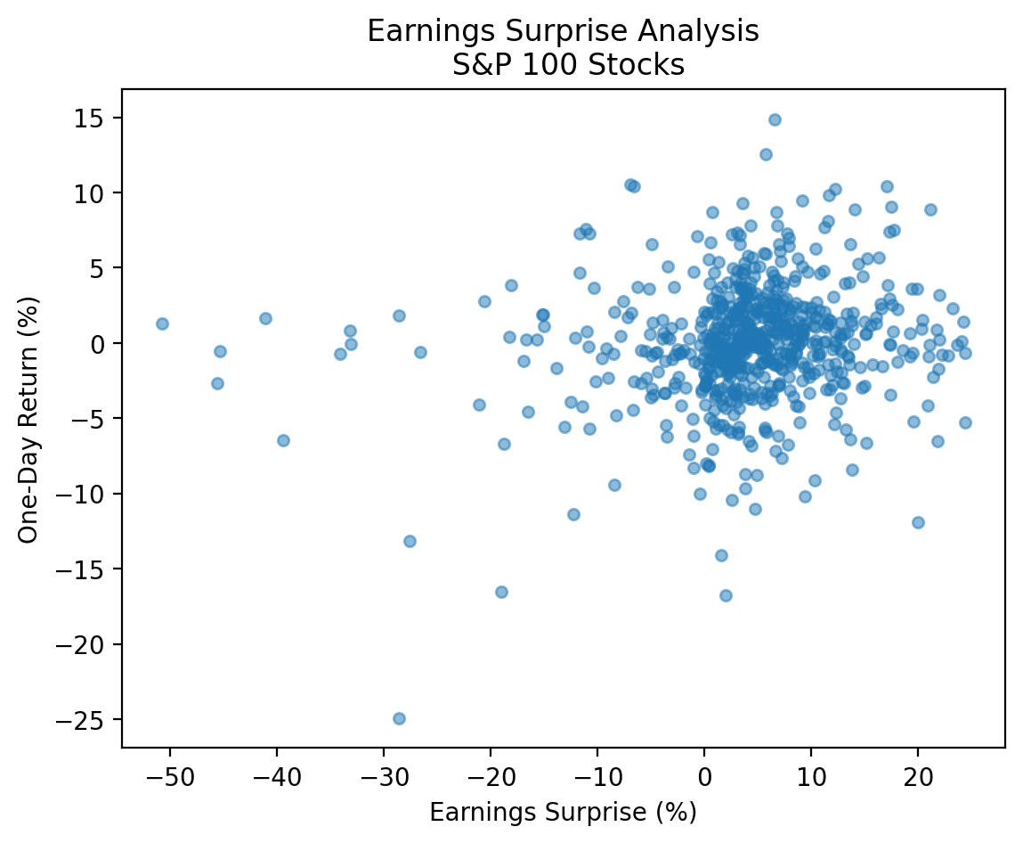 plt.title('Earnings Surprise Analysis\n S&P 100 Stocks')