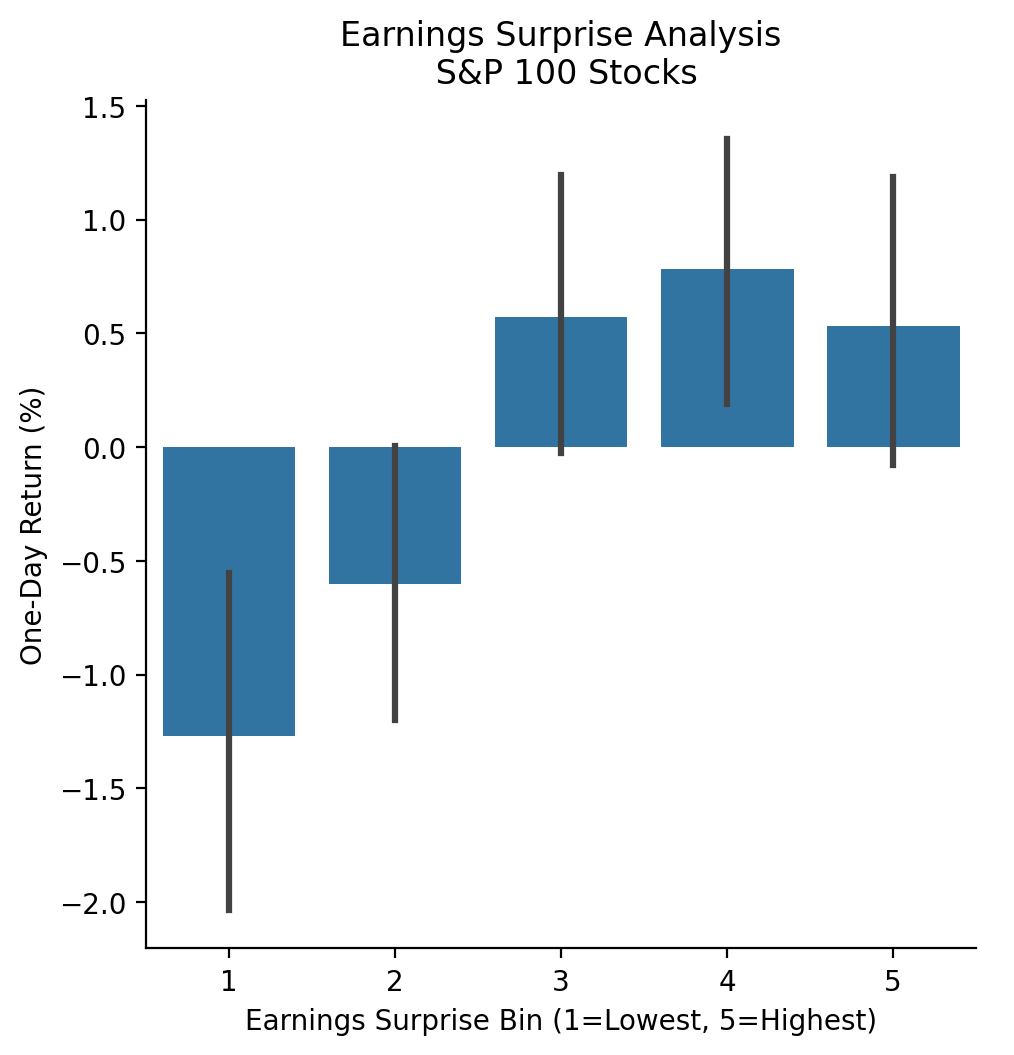 barplot()from the seaborn package after usingpd.qcut()to form five groups on earnings surprises