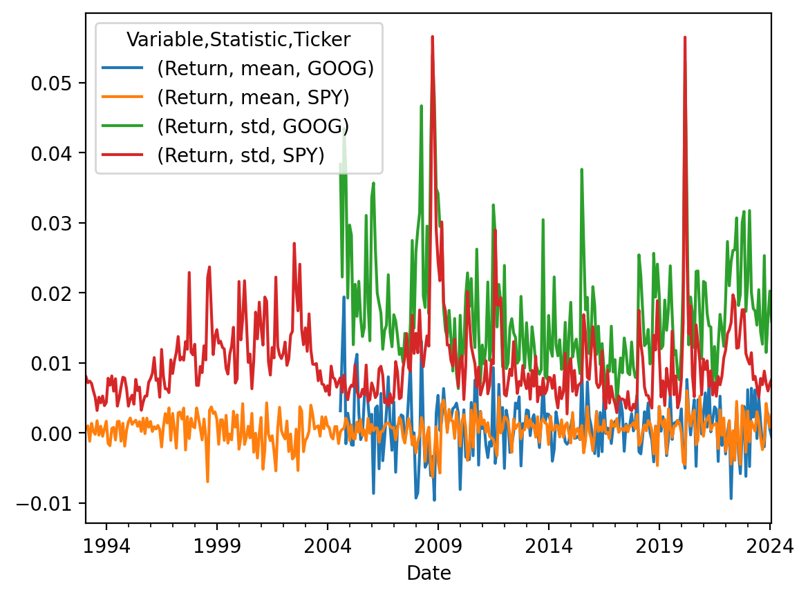 matana[_] = matana['Adj Close'].iloc[:-1].pct_change()We can use .agg() without .pivot_table() or .groupby()! We have wide data, so the tickers will be in the columns.