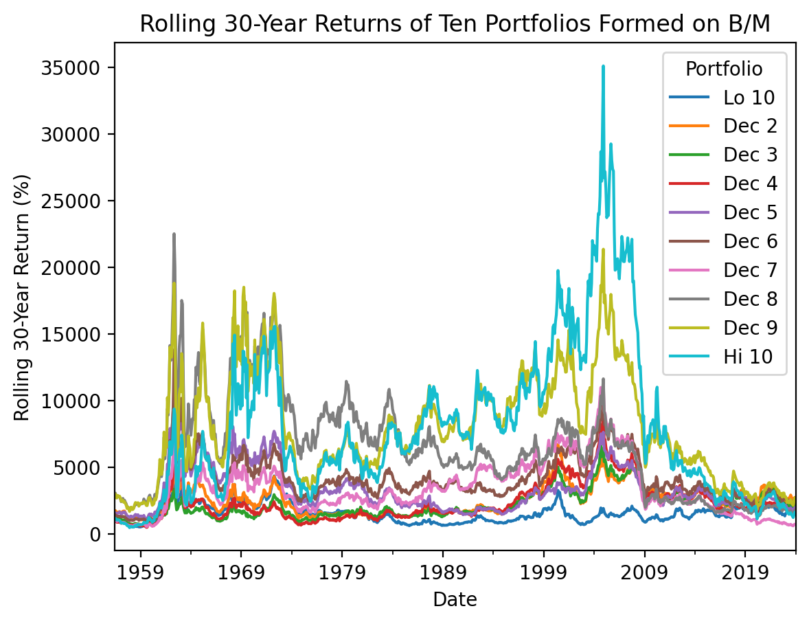 plt.title('Rolling 30-Year Returns of Ten Portfolios Formed on B/M')