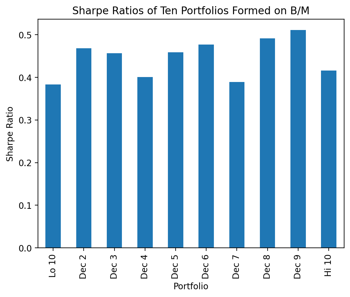 - The last 10 columns provide 10 portfolios split on the 10th, 20th, …, and 90th percentiles of B/M (i.e., deciles).
