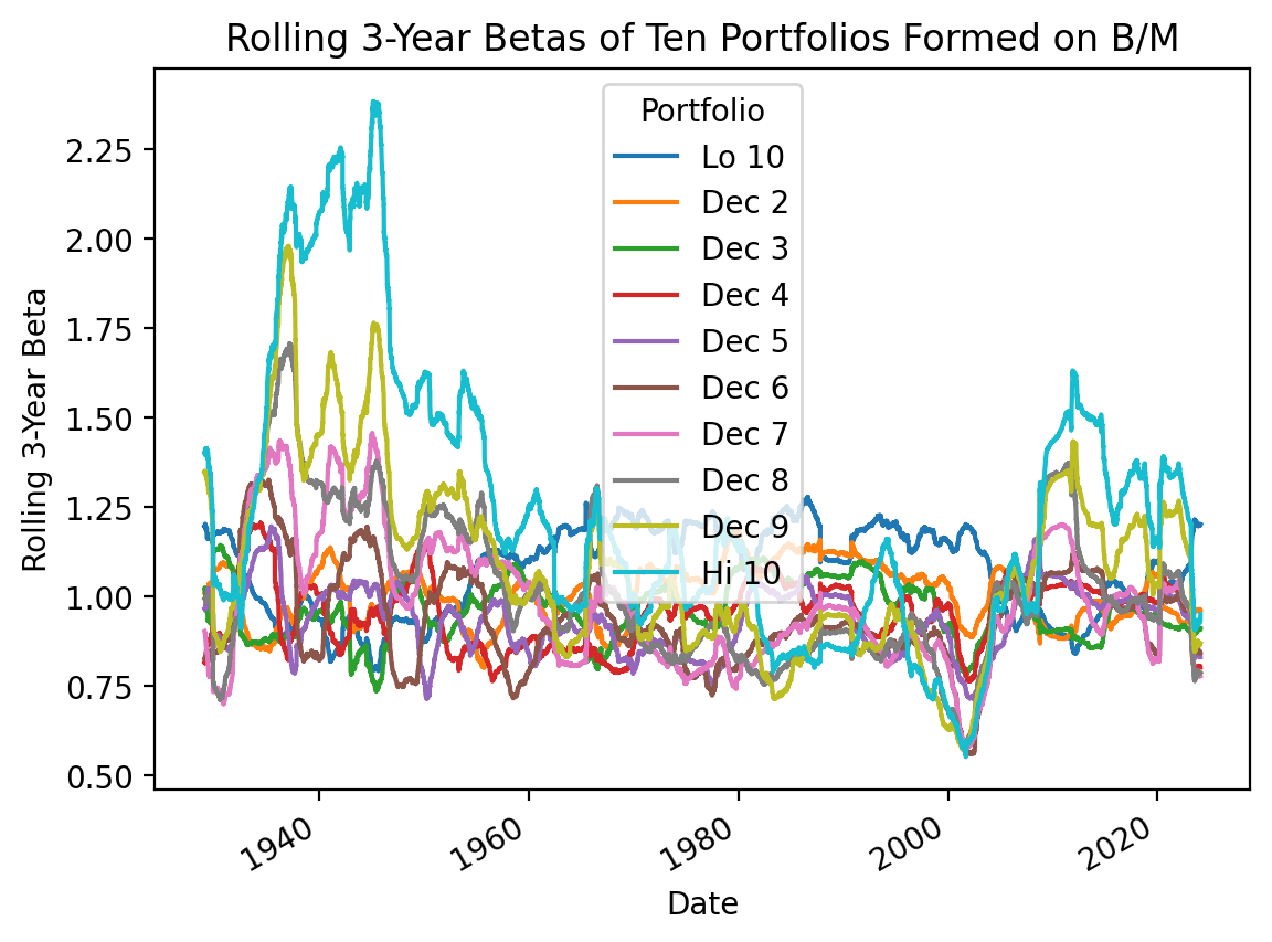 Calculate rolling capital asset pricing model (CAPM) betas for the MATANA stocks ten portfolios formed on B/M.