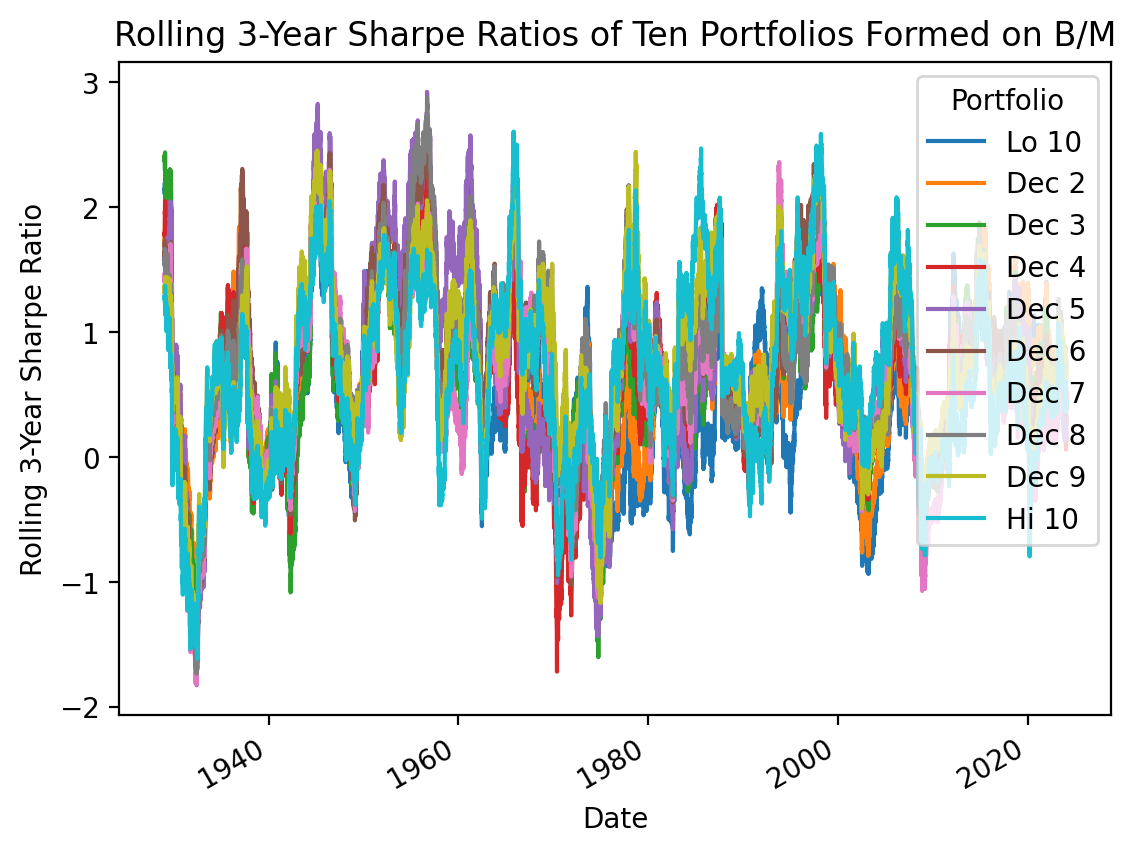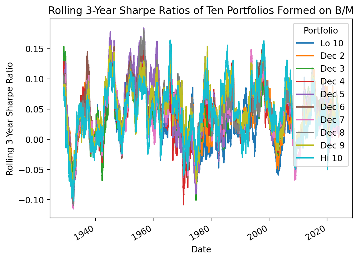 Calculate rolling Sharpe Ratios for the MATANA stocks ten portfolios formed on B/M.