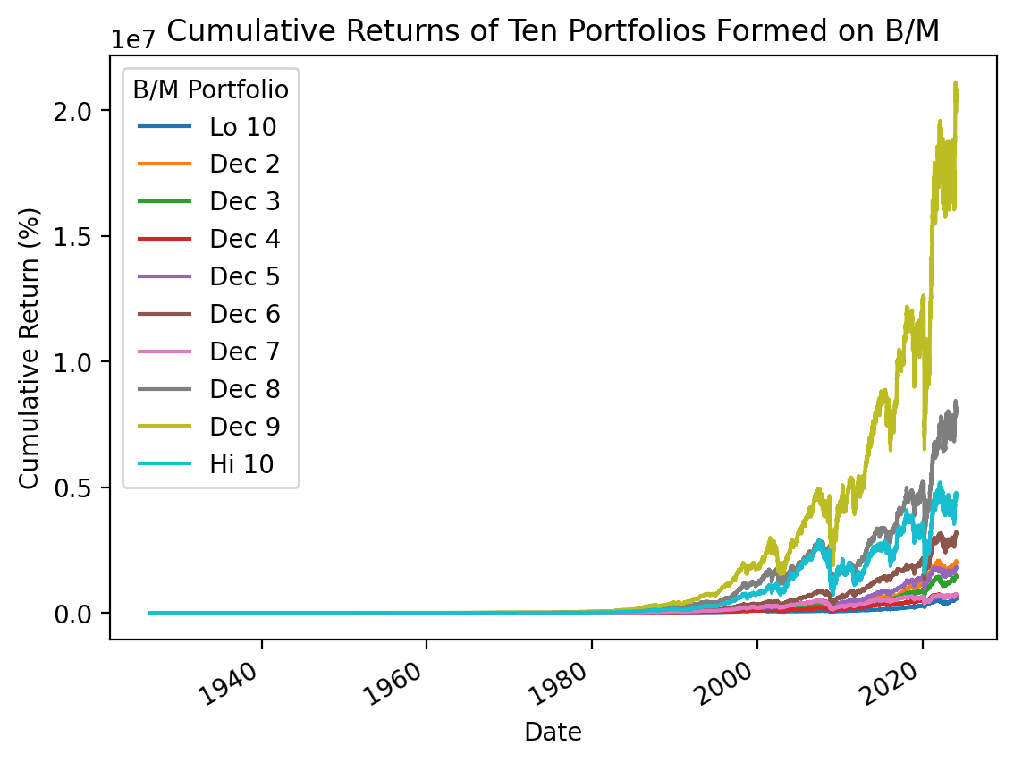 - The last 10 columns provide 10 portfolios split on the 10th, 20th, …, and 90th percentiles of B/M (i.e., deciles).