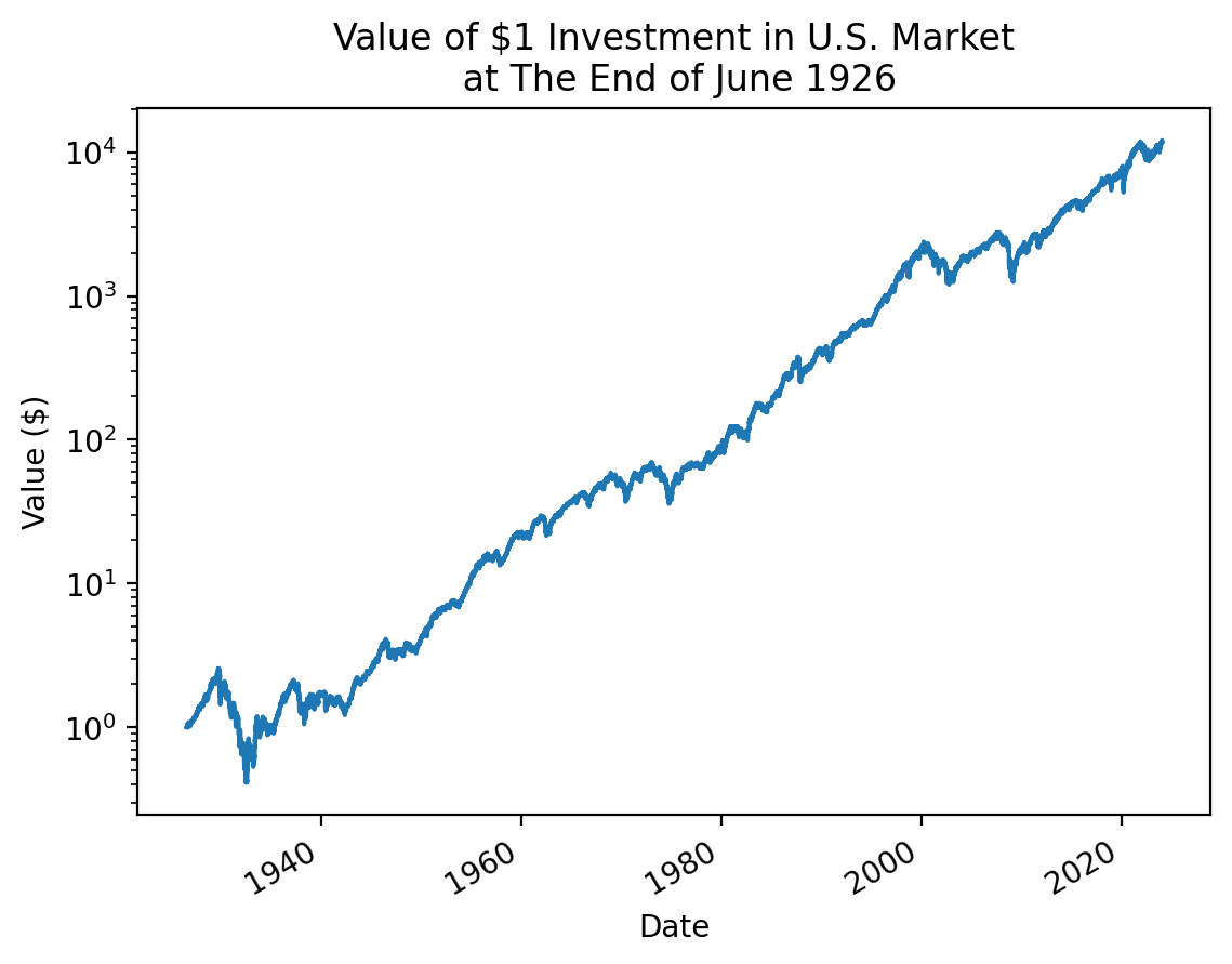 plt.title('Value of $1 Investment in U.S. Market\n at The End of June 1926')