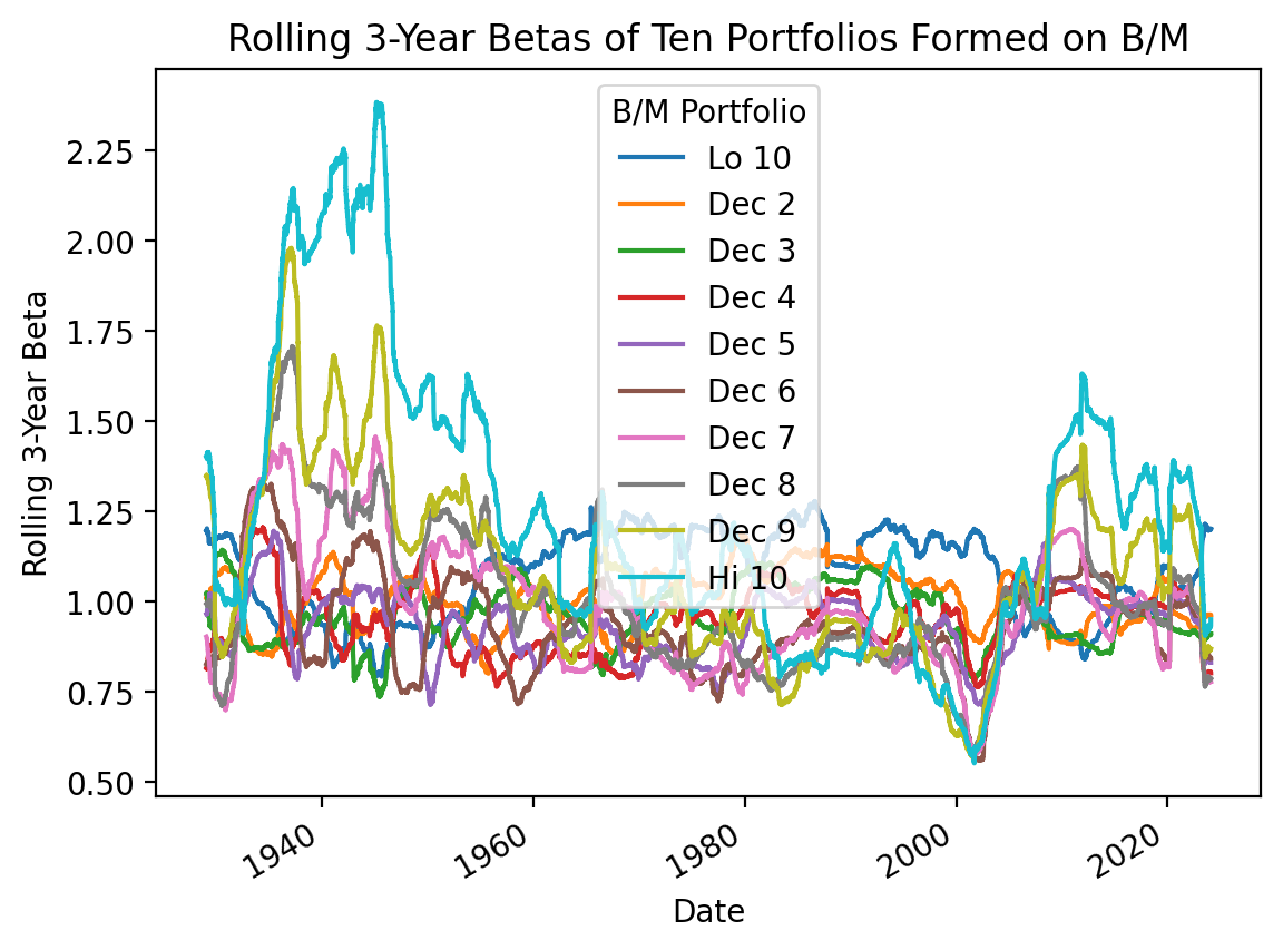 Calculate rolling capital asset pricing model (CAPM) betas for the MATANA stocks ten portfolios formed on B/M.